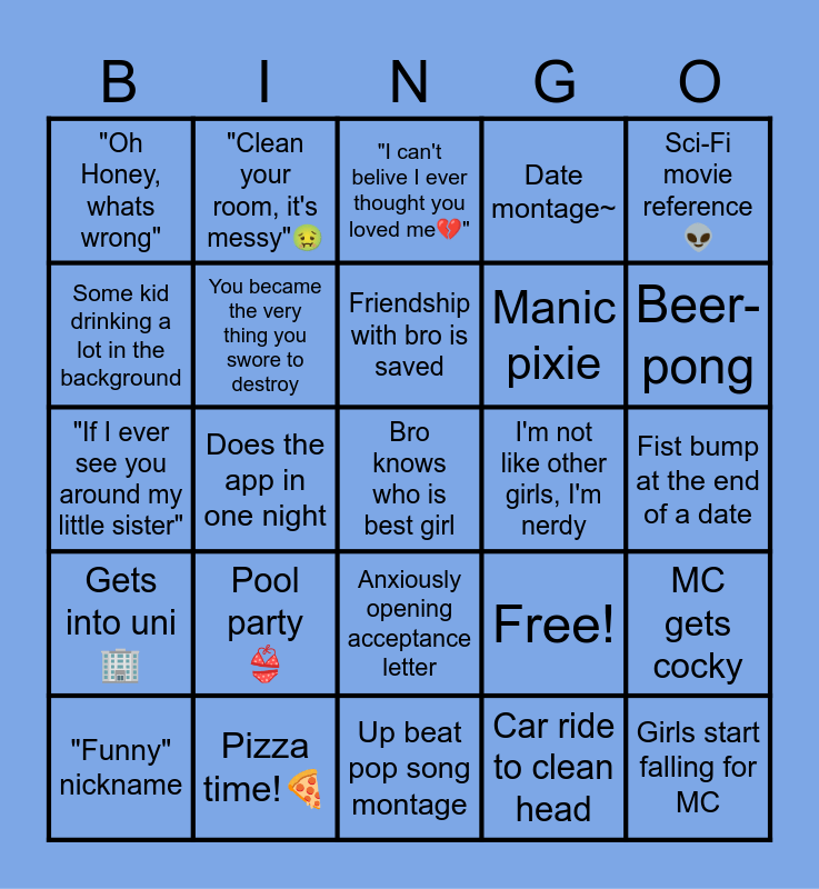 This bingo card has 25 words: Pool party👙, Up beat pop song montage, Friendship with bro is saved, "Funny" nickname, Sci-Fi movie reference👽, "Oh Honey, whats wrong", Some kid drinking a lot in the background, "Clean your room, it's messy"🤢, I'm not like other girls, I'm nerdy, Anxiously opening acceptance letter, Manic pixie, "If I ever see you around my little sister", Free!, MC gets cocky, You became the very thing you swore to destroy, Girls start falling for MC, Fist bump at the end of a date, "I can't belive I ever thought you loved me💔", Beer-pong, Does the app in one night, Bro knows who is best girl, Pizza time!🍕, Gets into uni🏢, Date montage~ and Car ride to clean head.
