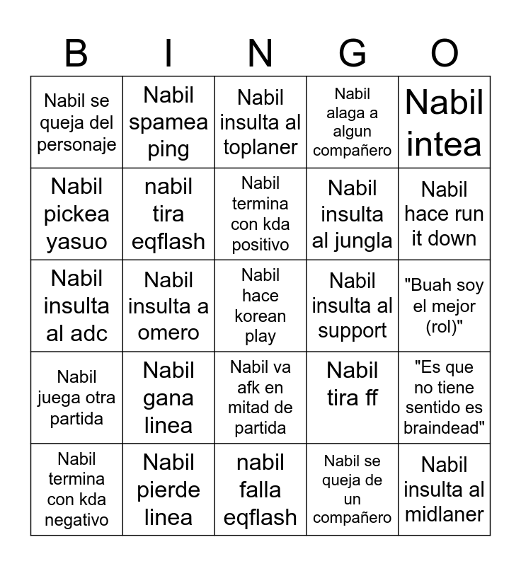 This bingo card has a free space and 24 words: Nabil gana linea, Nabil pierde linea, Nabil termina con kda positivo, Nabil termina con kda negativo, Nabil intea, Nabil se queja del personaje, Nabil pickea yasuo, Nabil spamea ping, Nabil insulta al support, Nabil va afk en mitad de partida, Nabil insulta al jungla, Nabil insulta al adc, Nabil tira ff, "Es que no tiene sentido es braindead", nabil tira eqflash, Nabil se queja de un compañero, "Buah soy el mejor (rol)", Nabil insulta al toplaner, Nabil hace run it down, Nabil insulta a omero, Nabil insulta al midlaner, Nabil juega otra partida, Nabil alaga a algun compañero and nabil falla eqflash.