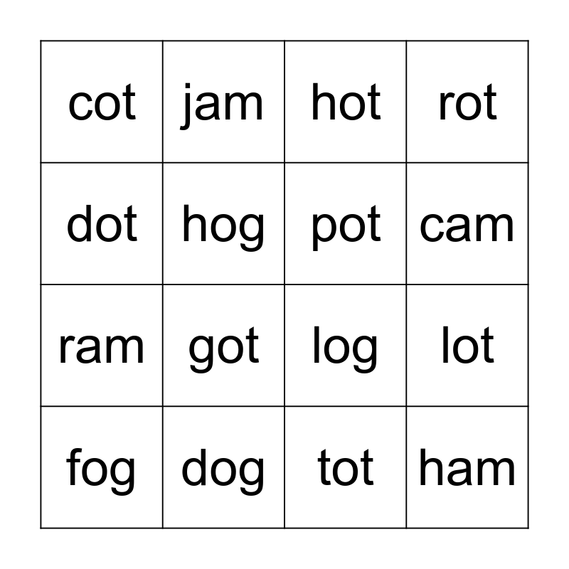 This bingo card has 16 words: dog, lot, hot, cot, ram, jam, log, tot, dot, hog, fog, rot, got, cam, pot and ham.