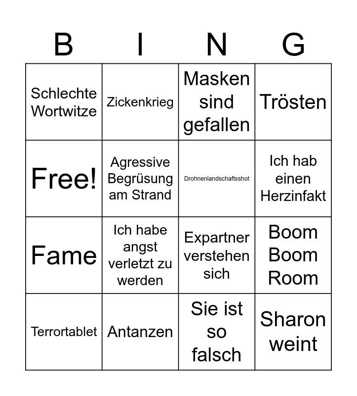 This bingo card has 16 words: Antanzen, Boom Boom Room, Masken sind gefallen, Schlechte Wortwitze, Fame, Zickenkrieg, Expartner verstehen sich, Sie ist so falsch, Free!, Agressive Begrüsung am Strand, Terrortablet, Trösten, Ich habe angst verletzt zu werden, Ich hab einen Herzinfakt, Drohnenlandschaftsshot and Sharon weint.