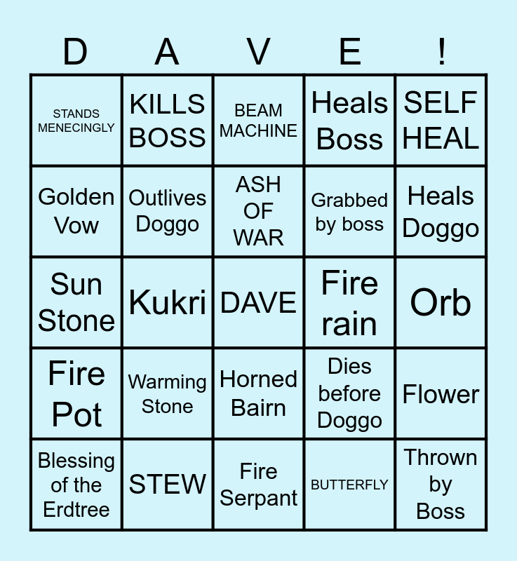 This bingo card has a free space and 24 words: Blessing of the Erdtree, Warming Stone, ASH OF WAR, BUTTERFLY, SELF HEAL, STANDS MENECINGLY, KILLS BOSS, BEAM MACHINE, Fire rain, Orb, Sun Stone, Outlives Doggo, Dies before Doggo, Flower, Golden Vow, STEW, Fire Serpant, Heals Boss, Heals Doggo, Fire Pot, Kukri, Horned Bairn, Grabbed by boss and Thrown by Boss.