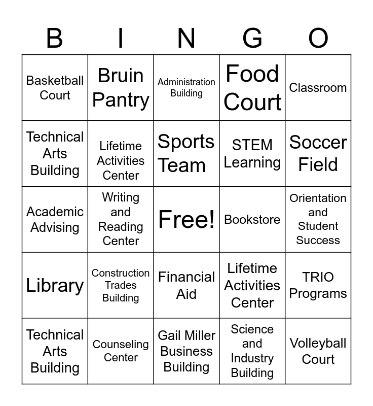 This bingo card has a free space and 24 words: Construction Trades Building, Counseling Center, Sports Team, Technical Arts Building, Classroom, Basketball Court, Technical Arts Building, Bruin Pantry, Bookstore, Financial Aid, STEM Learning, Academic Advising, Lifetime Activities Center, TRIO Programs, Lifetime Activities Center, Science and Industry Building, Orientation and Student Success, Administration Building, Soccer Field, Writing and Reading Center, Volleyball Court, Library, Food Court and Gail Miller Business Building.