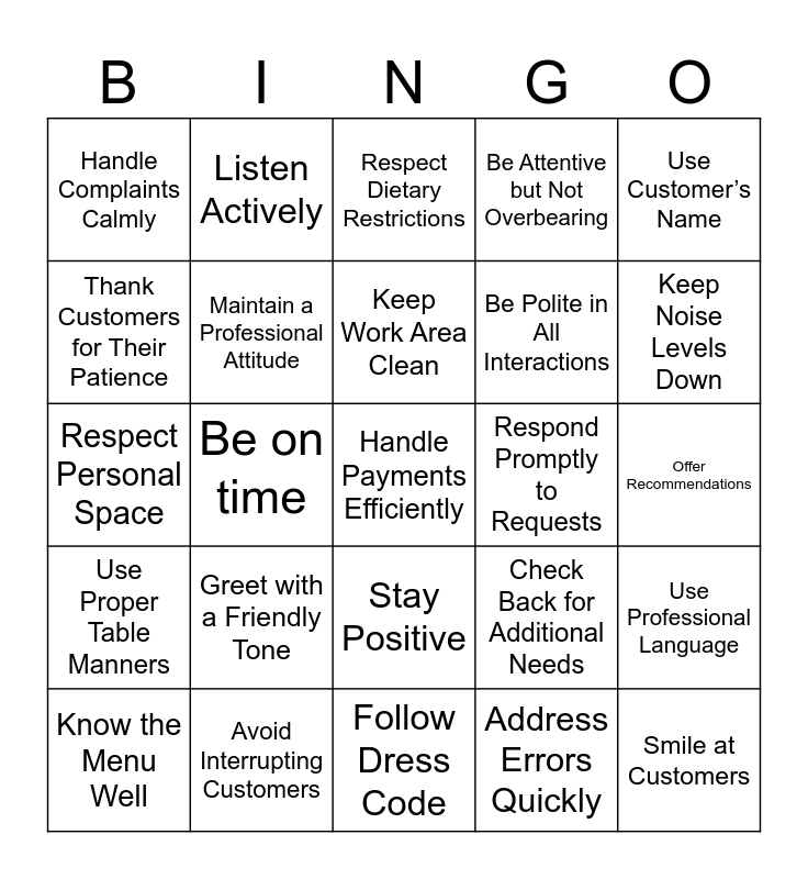 This bingo card has a free space and 24 words: Greet with a Friendly Tone, Avoid Interrupting Customers, Keep Work Area Clean, Know the Menu Well, Use Customer’s Name, Handle Complaints Calmly, Thank Customers for Their Patience, Listen Actively, Respond Promptly to Requests, Stay Positive, Be Polite in All Interactions, Respect Personal Space, Check Back for Additional Needs, Use Professional Language, Maintain a Professional Attitude, Address Errors Quickly, Offer Recommendations, Respect Dietary Restrictions, Keep Noise Levels Down, Be on time, Smile at Customers, Use Proper Table Manners, Be Attentive but Not Overbearing and Follow Dress Code.