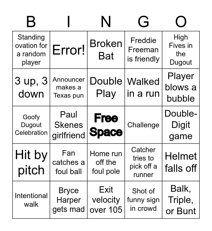 This bingo card has a free space and 34 words: Runner Caught Stealing, Shot of funny sign in crowd, Diving catch in outfield, Single, Hit by pitch, Announcer makes a Texas pun, High Fives in the Dugout, Intentional walk, Error!, Double, Double Play, Broken Bat, Home run, Stolen Base, Challenge, Player blows a bubble, Bryce Harper gets mad, Goofy Dugout Celebration, Fan catches a foul ball, Catcher tries to pick off a runner, Home run off the foul pole, Wild Pitch, Standing ovation for a random player, Double-Digit game, Exit velocity over 105, Balk, Triple, or Bunt, Freddie Freeman is friendly, Mic'd up player makes a good play, Walked in a run, 3 up, 3 down, Extra Base hit with bases loaded, Paul Skenes girlfriend, Helmet falls off and Announcers mention Texas heat.