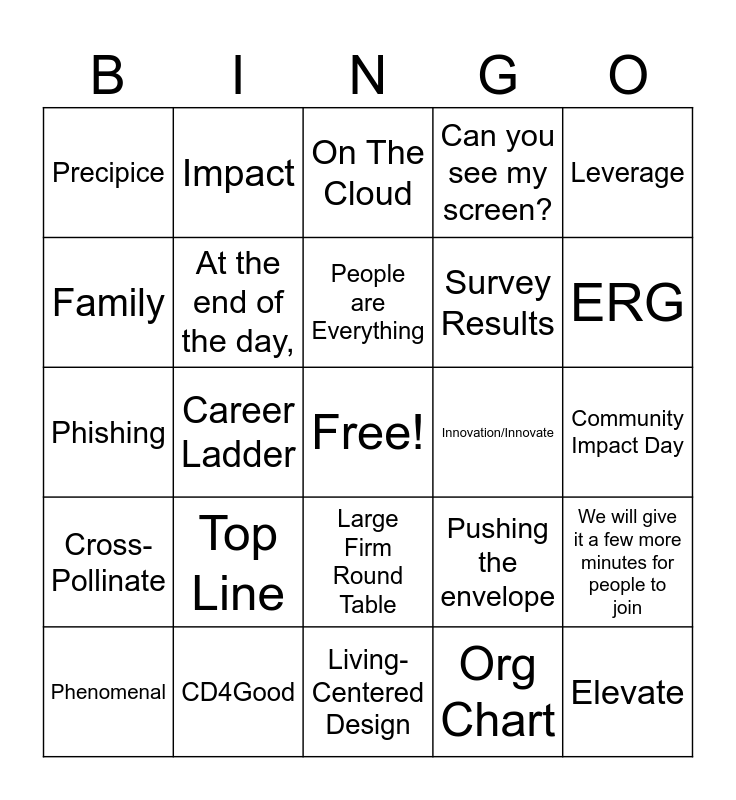 This bingo card has a free space and 47 words: Flourish, Elevate, SFMO, Living-Centered Design, Top Line, Bottom Line, Impact, Framework, Family, Move The Needle, At the end of the day,, Can you see my screen?, We will give it a few more minutes for people to join, Pushing the envelope, Groundbreaking, Forefront of ___, People are Everything, Innovation/Innovate, Ai, Leverage, Career Ladder, Org Chart, Precipice, Survey Results, YTD Target, ERG, Phenomenal, Unbelievable, Large Firm Round Table, Cross-Pollinate, Spark, Remarkable, Culture Building Opportunity, Spotlight, Strategic Framework, CD4Good, Community Impact Day, Moxie, Open Hand Studio, Recruit and Retain, SharePoint, On The Cloud, Phishing, Circle Back, Thinking outside of the box, Hit the ground running and Next level Win.