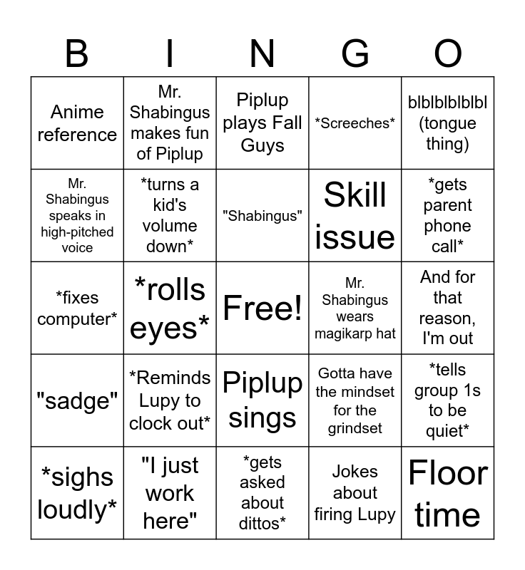 This bingo card has a free space and 26 words: Piplup sings, Jokes about firing Lupy, "Shabingus", "I just work here", blblblblblbl (tongue thing), Anime reference, Mr. Shabingus speaks in high-pitched voice, Mr. Shabingus makes fun of Piplup, And for that reason, I'm out, Gotta have the mindset for the grindset, Skill issue, *fixes computer*, *tells group 1s to be quiet*, *sighs loudly*, *rolls eyes*, *takes nap*, *Screeches*, "sadge", Piplup plays Fall Guys, Floor time, *gets parent phone call*, *gets asked about dittos*, Mr. Shabingus wears magikarp hat, *Reminds Lupy to clock out*, *turns a kid's volume down* and *tells kids they can't get seconds*.
