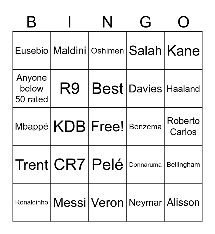 This bingo card has a free space and 24 words: Ronaldinho, CR7, Best, Neymar, Kane, Eusebio, Maldini, Oshimen, Benzema, Roberto Carlos, Mbappé, R9, Donnaruma, Bellingham, Anyone below 50 rated, Messi, Veron, Salah, Haaland, Trent, KDB, Pelé, Davies and Alisson.
