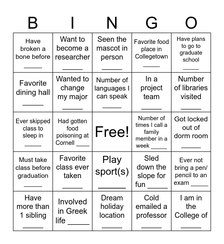 This bingo card has a free space and 24 words: Favorite class ever taken _____, Involved in Greek life _____, Number of languages I can speak _____, Have more than 1 sibling _____, Have plans to go to graduate school _____, Have broken a bone before _____, Favorite dining hall _____, Want to become a researcher _____, Number of times I call a family member in a week _____, Play sport(s) _____, In a project team _____, Ever skipped class to sleep in _____, Sled down the slope for fun _____, Ever not bring a pen/ pencil to an exam _____, Wanted to change my major _____, Cold emailed a professor _____, Got locked out of dorm room _____, Seen the mascot in person _____, Number of libraries visited _____, Had gotten food poisoning at Cornell ____, I am in the College of _____, Must take class before graduation _____, Favorite food place in Collegetown _____ and Dream holiday location _____.
