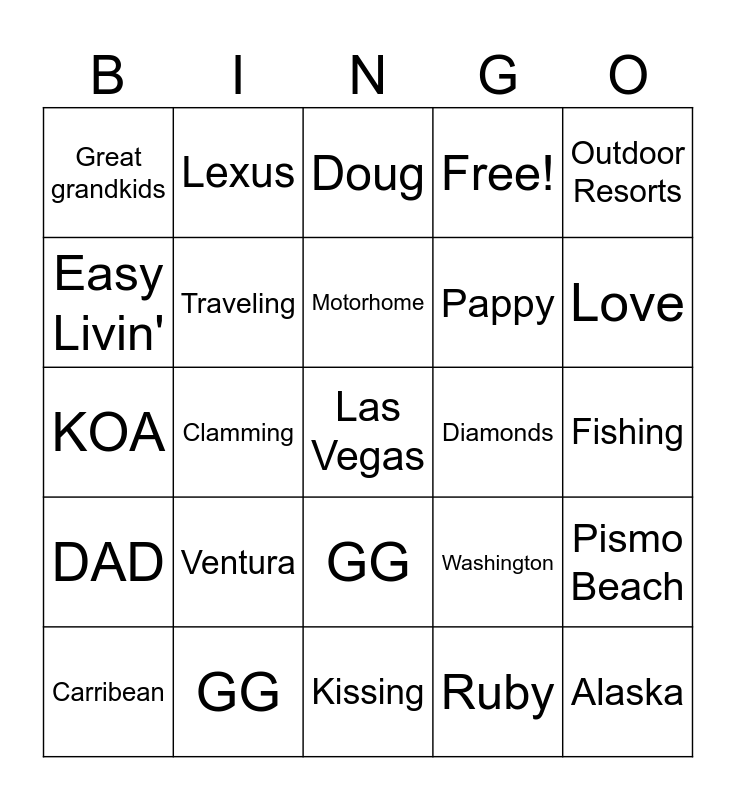 This bingo card has 80 words: Linda, Kelly, Doug, Shawn, Jill, Hayli, Kennedy, Ryli, Marli, Carsen, Taylor, Grandkids, Free!, Great grandkids, Hobo, Easy Livin', Via Arroyo, Ventura, Boating, Fishing, Indio, Outdoor Resorts, KOA, Motorhome, Traveling, Camping, Sidney, Miles, Carly, Laughter, Love, Holding hands, Kissing, Alaska, Carribean, Diamonds, Hawaii, Heritage Palms, Married, Las Vegas, Cruises, New Year's Day party, Golf cart, Golfing, Fishing, Lexus, Mercedes, Putters, Cookies, Family, Pismo Beach, Clamming, Washington, Jefferson, Erby & Nella, Camel, Elvis, Frank Sinatra, Because of You, GG, Pappy, Vows, Carribean, Golf clubs, Salmon, Halibut, Big Bear, The Sierras, Foster's Donuts, MOM, DAD, GG, PAPPY, Grandma, Grandpa, Lucy, Ruby, Horn Realty, Lawry's and Homer, Alaska.
