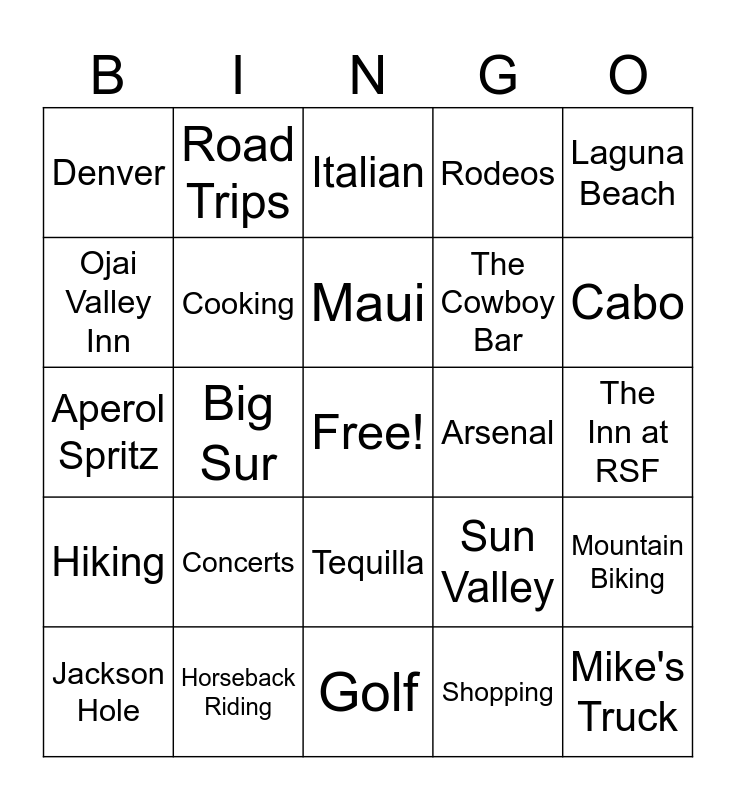 This bingo card has a free space and 24 words: Concerts, Horseback Riding, Maui, Jackson Hole, Laguna Beach, Denver, Ojai Valley Inn, Road Trips, Arsenal, Tequilla, The Cowboy Bar, Aperol Spritz, Sun Valley, Mountain Biking, Cooking, Shopping, The Inn at RSF, Italian, Cabo, Big Sur, Mike's Truck, Hiking, Rodeos and Golf.