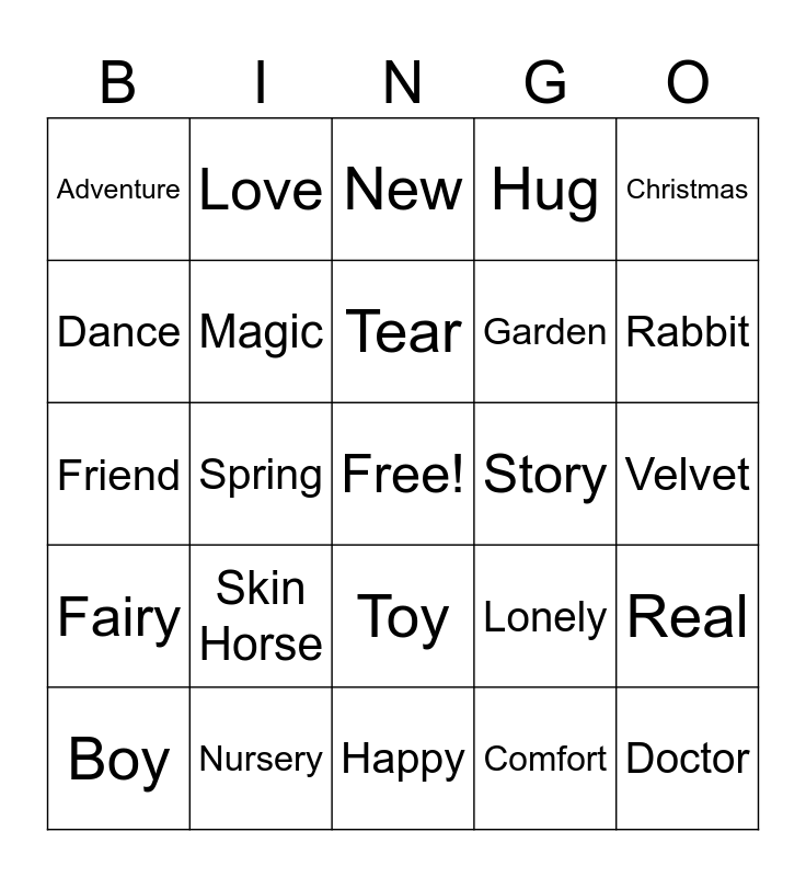 This bingo card has a free space and 24 words: Skin Horse, Nursery, Tear, Boy, Christmas, Adventure, Dance, Love, Story, Toy, Garden, Friend, Lonely, Real, Magic, Comfort, Velvet, New, Rabbit, Spring, Doctor, Fairy, Hug and Happy.