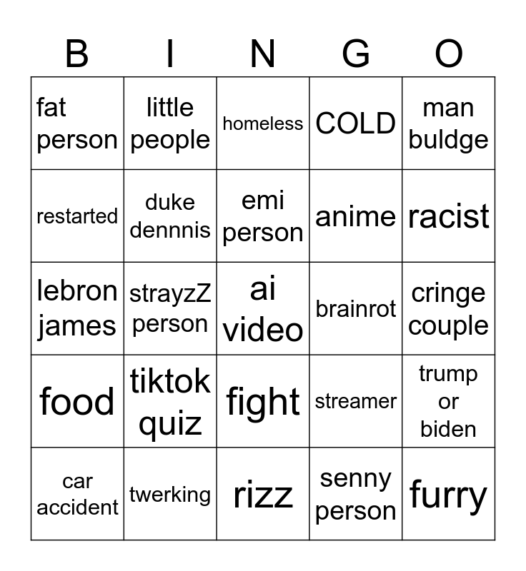This bingo card has 25 words: food, twerking, ai video, senny person, man buldge, fat person, little people, homeless, brainrot, trump or biden, restarted, duke dennnis, rizz, streamer, racist, car accident, strayzZ person, emi person, anime, cringe couple, lebron james, tiktok quiz, fight, COLD and furry.