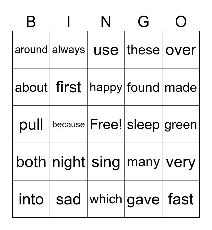 This bingo card has a free space and 24 words: night, sad, happy, into, over, around, about, always, sleep, sing, found, pull, many, very, first, gave, green, use, made, because, fast, both, these and which.