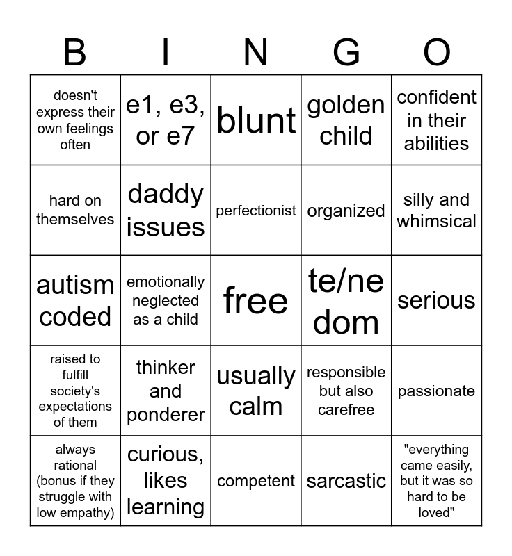 This bingo card has a free space and 24 words: thinker and ponderer, curious, likes learning, perfectionist, always rational (bonus if they struggle with low empathy), confident in their abilities, doesn't express their own feelings often, hard on themselves, e1, e3, or e7, te/ne dom, usually calm, organized, autism coded, responsible but also carefree, passionate, daddy issues, sarcastic, serious, blunt, silly and whimsical, emotionally neglected as a child, "everything came easily, but it was so hard to be loved", raised to fulfill society's expectations of them, golden child and competent.