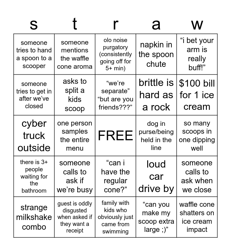This bingo card has a free space and 38 words: “what flavors do you have?”, someone asks for the “berries berries berries” flavor, “can i see the ice cream?”, asks to split a kids scoop, someone calls to ask when we close, someone calls to ask if we’re busy, “we’re separate” “but are you friends???”, “what is a LOVENUT??”, “i bet your arm is really buff!”, brittle is hard as a rock, one person samples the entire menu, napkin in the spoon chute, waffle cone shatters on ice cream impact, so many scoops in one dipping well, someone tries to get in after we’ve closed, there is 3+ people waiting for the bathroom, guest leaning over glass and pointing at flavors, olo noise purgatory (consistently going off for 5+ min), “do you have cookies and cream/cotton candy/bubblegum?”, dog in purse/being held in the line, someone tries to hand a spoon to a scooper, guest is oddly disgusted when asked if they want a receipt, $100 bill for 1 ice cream, strange milkshake combo, a child orders strawcoco, family with kids who obviously just came from swimming, couple doing PDA in the line, line is around the corner, guest asks for an east coast exclusive flavor, “what does the V mean?”, chocolate gooey brownie is soup., “can i have the regular cone?”, “can you make my scoop extra large ;)”, someone mentions the waffle cone aroma, guest brings up the yard / has yard ice cream, loud car drive by, cyber truck outside and terrible parking job visible from the store.