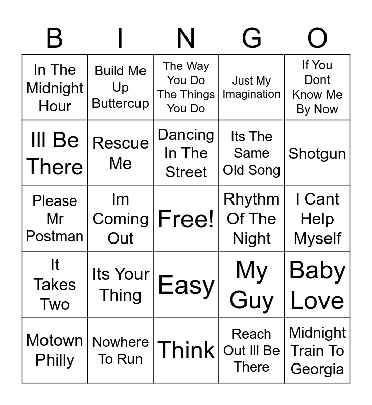 This bingo card has a free space and 65 words: ABC, Aint No Mountain High Enough, Aint Nothing Like The Real Thing, Baby Love, Back At One, Brick House, Build Me Up Buttercup, Cupid, Dancing In The Street, Do You Love Me, Easy, Endless Love, I Cant Help Myself, If You Dont Know Me By Now, Heard It Through The Grapevine, Ill Be There, Im Coming Out, In The Midnight Hour, I Second That Emotion, Its The Same Old Song, Its Your Thing, It Takes Two, Just My Imagination, Lets Get It On, Lets Stay Together, Heat Wave, Love Train, Mercy Mercy Me, Midnight Train To Georgia, Money (Thats What I Want), Motown Philly, Mustang Sally, My Cherie Amour, My Girl, My Guy, Nowhere To Run, Part Time Lover, Please Mr Postman, Reach Out Ill Be There, Reflections, Rescue Me, Respect, Rhythm Of The Night, Rockin Robin, Sexual Healing, Shop Around, Shotgun, Sittin On The Dock Of The Bay, Soul Man, Stop In The Name Of Love, Superfreak, Superstition, Tears Of A Clown, Think, Tracks Of My Tears, Twist And Shout, War, The Way You Do The Things You Do, What Becomes Of The Brokenhearted, Whats Going On, Where Did Our Love Go, Will You Still Love Me Tomorrow, You Cant Hurry Love, Youve Really Got A Hold On Me and Aint Too Proud To Beg.