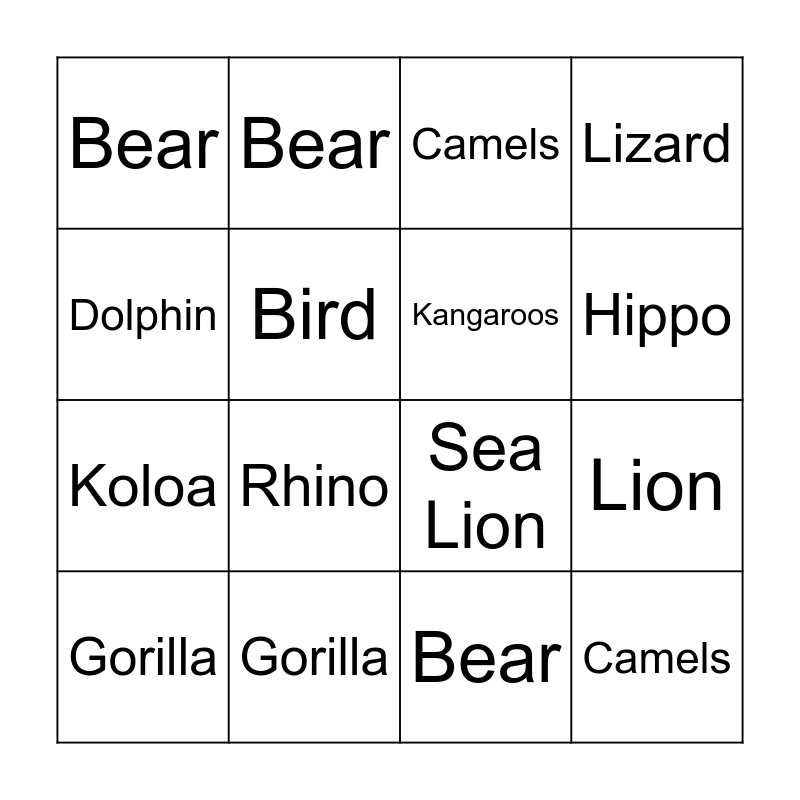 ⚠ This card has duplicate items: Gorilla (3), Penguin (3), Dolphin (3), Lion (3), Tiger (3), Bear (3), Koloa (3), Bird (3), Rhino (3), Kangaroos (3), Lizard (3), Sea Lion (3), Camels (3), Butterfly (3), Wolf (3), Hippo (3)