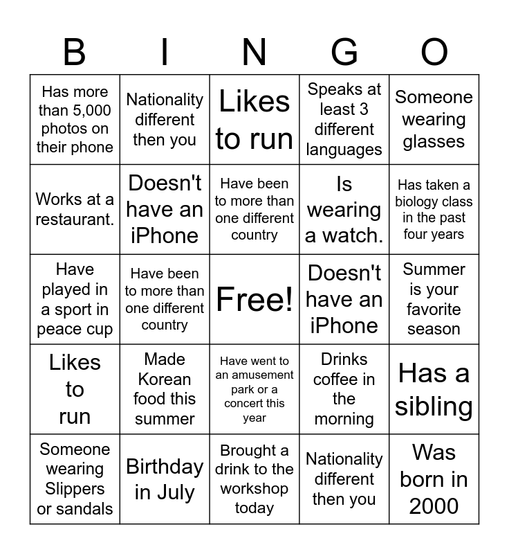 This bingo card has a free space and 32 words: Nationality different then you, Has a different favorite ice cream flavor then you, Have been to more than one different country, Has a pet, Likes to run, Doesn't have an iPhone, Someone wearing glasses, Has a sibling, Nationality different then you, Has a different favorite ice cream flavor then you, Have been to more than one different country, Likes to run, Has a pet, Has a sibling, Doesn't have an iPhone, Someone wearing glasses, Someone wearing Slippers or sandals, Have played in a sport in peace cup, Have went to an amusement park or a concert this year, Made Korean food this summer, Drinks coffee in the morning, Prefers coke over sprite, Summer is your favorite season, Birthday in July, Was born in 2000, Speaks at least 3 different languages, Is wearing a watch., Works at a restaurant., Has more than 5,000 photos on their phone, Brought a drink to the workshop today, Won first place for a sport at Peace Cup (can be either 1st or 2nd one) and Has taken a biology class in the past four years.