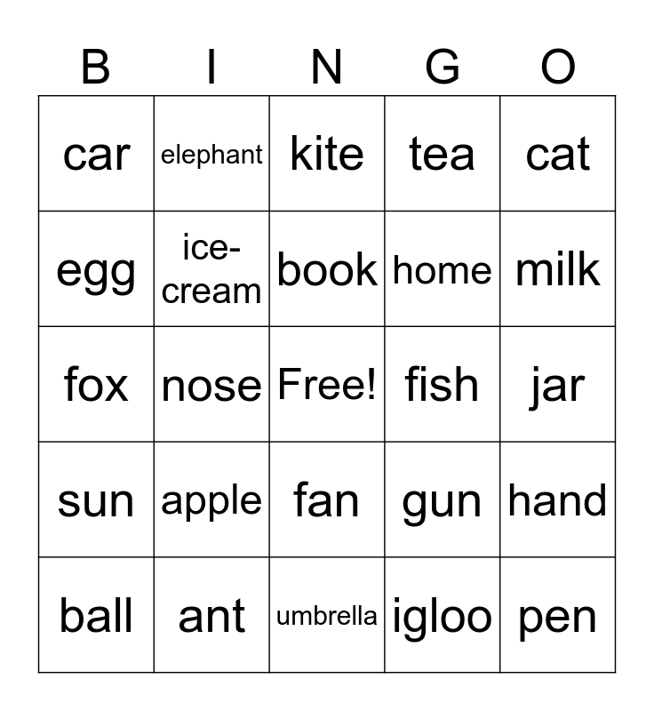 This bingo card has a free space and 24 words: apple, ant, book, ball, cat, car, egg, elephant, fish, fan, home, fox, gun, hand, ice-cream, igloo, jar, kite, milk, nose, pen, sun, tea and umbrella.