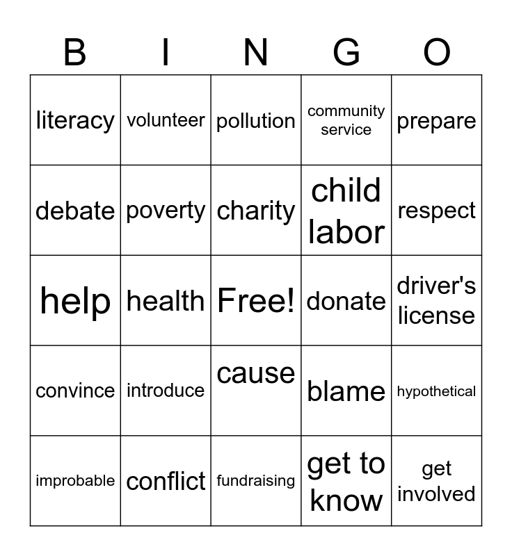 This bingo card has a free space and 30 words: conflict, education, health, housing, literacy, pollution, poverty, cause, donate, fundraising, driver's license, get involved, get to know, santitation, respect, encourage, blame, convince, introduce, prepare, help, teach, volunteer, child labor, debate, community service, hypothetical, improbable, charity and hurricane.