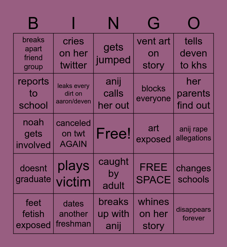 This bingo card has a free space and 25 words: plays victim, breaks up with anij, anij calls her out, feet fetish exposed, tells deven to khs, breaks apart friend group, reports to school, cries on her twitter, art exposed, caught by adult, blocks everyone, noah gets involved, FREE SPACE, changes schools, leaks every dirt on aaron/deven, gets michael to cut off deven, anij rape allegations, gets jumped, her parents find out, canceled on twt AGAIN, disappears forever, dates another freshman, doesnt graduate, vent art on story and whines on her story.