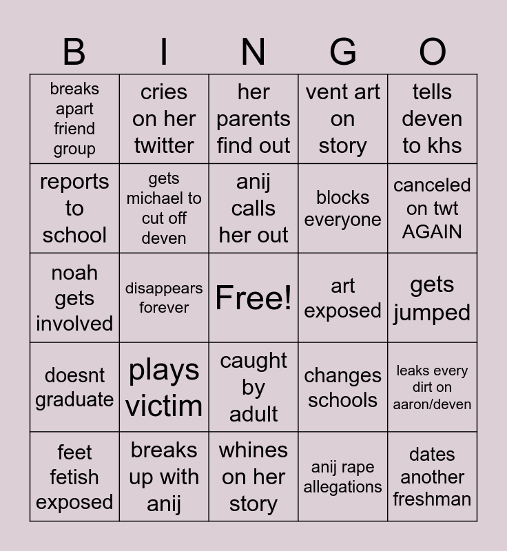 This bingo card has a free space and 24 words: plays victim, breaks up with anij, anij calls her out, feet fetish exposed, tells deven to khs, breaks apart friend group, reports to school, cries on her twitter, art exposed, caught by adult, blocks everyone, noah gets involved, changes schools, leaks every dirt on aaron/deven, gets michael to cut off deven, anij rape allegations, gets jumped, her parents find out, canceled on twt AGAIN, disappears forever, dates another freshman, doesnt graduate, vent art on story and whines on her story.