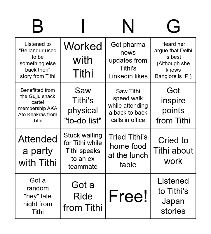 This bingo card has 17 words: Free!, Got a random "hey" late night from Tithi, Got pharma news updates from Tithi's Linkedin likes, Listened to "Bellandur used to be something else back then" story from Tithi, Stuck waiting for Tithi while Tithi speaks to an ex teammate, Heard her argue that Delhi is best (Although she knows Banglore is :P ), Cried to Tithi about work, Saw Tithi speed walk while attending a back to back calls in office, Got inspire points from Tithi, Saw Tithi's physical "to-do list", Got a Ride from Tithi, Tried Tithi's home food at the lunch table, Benefitted from the Gujju snack cartel membership AKA Ate Khakras from Tithi, Worked with Tithi, Attended a party with Tithi, Met her in the office in her exclusive - belongs-to-no-one-else spot corner seat of high table spot in third floor and Listened to Tithi's Japan stories.