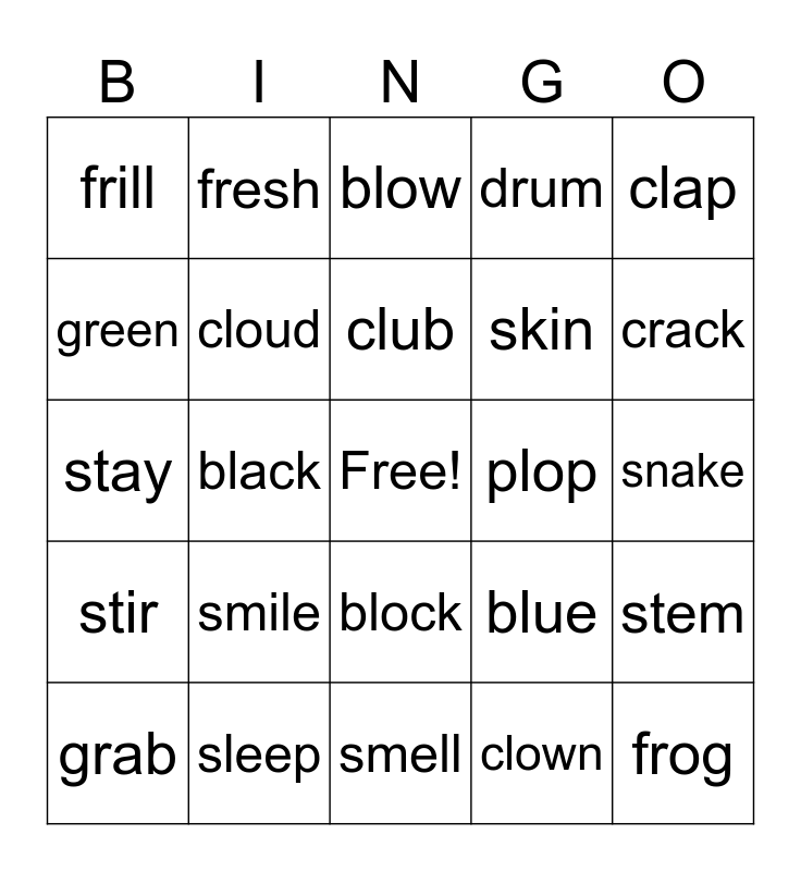 This bingo card has a free space and 34 words: crush, clown, flag, stunk, stir, cloud, clap, grab, fresh, swim, club, blow, drink, ride, plop, crack, sleep, stay, smile, blue, block, pride, frill, snake, smell, frog, drum, skate, skin, green, trip, black, stem and truck.