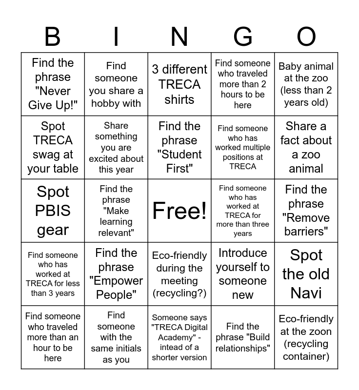 This bingo card has a free space and 27 words: Introduce yourself to someone new, Tell someone you know a new fact about you, Find someone who has worked multiple positions at TRECA, Someone says "TRECA Digital Academy" - intead of a shorter version, Spot TRECA swag at your table, 3 different TRECA shirts, Find someone you share a hobby with, Find someone who has worked at TRECA for less than 3 years, Find someone who has worked at TRECA for more than three years, Spot the old Navi, Spot PBIS gear, Find someone who traveled more than 2 hours to be here, Find someone who traveled more than an hour to be here, Find someone with the same initials as you, Share a fact about a zoo animal, Learn something new about a zoo animal, Share something you are excited about this year, Find the phrase "Student First", Find the phrase "Empower People", Find the phrase "Never Give Up!", Find the phrase "Remove barriers", Find the phrase "Build relationships", Find the phrase "Make learning relevant", Eco-friendly at the zoon (recycling container), Eco-friendly during the meeting (recycling?), Baby animal at the zoo (less than 2 years old) and Picture with your Dept..