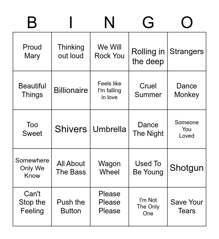 This bingo card has 25 words: All About The Bass, Please Please Please, Feels like I'm falling in love, Can't Stop the Feeling, Strangers, Proud Mary, Beautiful Things, Thinking out loud, Dance The Night, Wagon Wheel, Cruel Summer, Too Sweet, Used To Be Young, Shotgun, Billionaire, Save Your Tears, Someone You Loved, We Will Rock You, Dance Monkey, Shivers, Umbrella, Push the Button, Somewhere Only We Know, Rolling in the deep and I'm Not The Only One.