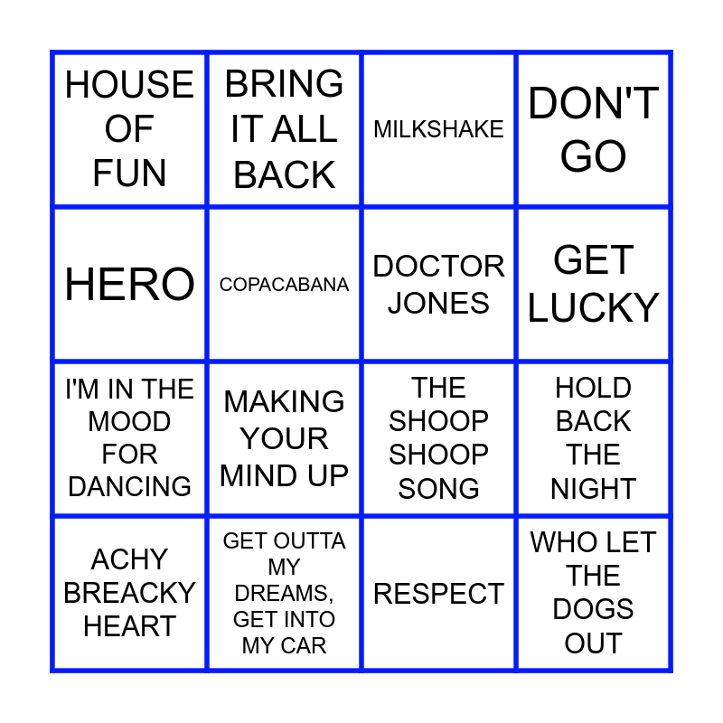 This bingo card has 50 words: 20TH CENTURY BOY, ACHY BREACKY HEART, AMERICAN PIE, BABOOSKA, BABY I LOVE YOUR WAY, BLUE (DA BA DEE), BRING IT ALL BACK, CHAIN REACTION, COPACABANA, DANCING IN THE STREETS, DOCTOR JONES, DON'T GO, DON'T STOP ME NOW, DYNAMITE, EVERY LITTLE THING SHE DOES IS MAGIC, GALWAY GIRL, GET LUCKY, GET OUTTA MY DREAMS, GET INTO MY CAR, GO WEST, HERO, HOLD BACK THE NIGHT, HOT IN THE CITY, HOUSE OF FUN, I'M IN THE MOOD FOR DANCING, LIVING DOLL, LOVIN' EACH DAY, MAKING YOUR MIND UP, MERCY, MILKSHAKE, MORE THAN A WOMAN, NOTHINGS GONNA STOP US NOW, PARADISE, PLACE YOUR HANDS, POKER FACE, POP MUSIK, PUMP UP THE JAM, PURE & SIMPLE, RASPUTIN, RED RED WINE, RESPECT, RUBY, S.O.S., SHOUT, SPIRIT IN THE SKY, THE FINAL COUNTDOWN, THE SHOOP SHOOP SONG, TOO SHY, WALK LIKE A MAN, WHO LET THE DOGS OUT and YELLOW SUBMARINE.