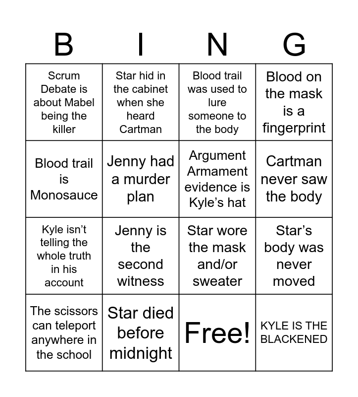 This bingo card has 17 words: Free!, The scissors can teleport anywhere in the school, Blood trail was used to lure someone to the body, Scrum Debate is about Mabel being the killer, Jenny is the second witness, Blood on the mask is a fingerprint, Star’s body was never moved, Argument Armament evidence is Kyle’s hat, Cartman never saw the body, Jenny had a murder plan, Star died before midnight, Star wore the mask and/or sweater, Blood trail is Monosauce, Star hid in the cabinet when she heard Cartman, Kyle isn’t telling the whole truth in his account, Black stained hair is Kyle’s and KYLE IS THE BLACKENED.
