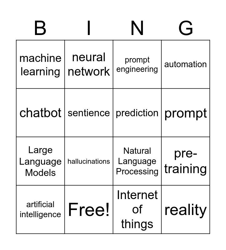 This bingo card has 16 words: Free!, pre-training, prompt engineering, machine learning, Large Language Models, neural network, Natural Language Processing, Internet of things, chatbot, sentience, artificial intelligence, automation, hallucinations, prompt, prediction and reality.