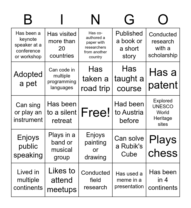 This bingo card has a free space and 79 words: Shares the same favorite programming language as you, Has presented a paper at a ML conference, Has co-authored a paper with researchers from another country, Has completed a marathon, Participated in a hackathon, Has performed in a theater production, Has experienced living in a different country, Loves dad jokes, Has received a grant for their research, Speaks four languages or more, Backpacked through multiple countries, Shares your favorite sport, Published a book or a short story, Has been a keynote speaker at a conference or workshop, Practices yoga regularly, Adopted a pet, Volunteers regularly, Plays in a band or musical group, Has read more than 50 books in a year, Explored UNESCO World Heritage sites, Has taken a cooking class, Conducted research with a scholarship, Can sing or play an instrument, Has taken a road trip, Can code in multiple programming languages, Mentored someone, Has given a remote presentation, Has hiked famous trails (e.g., Appalachian Trail, Camino de Santiago), Fostered or adopted a pet, Favorite colour is the same as yours, Has a patent, Practices a water sport (e.g., swimming, kayaking, surfing), Conducted field research, Has a diving license, Lived in multiple continents, Had been to Austria before, Had a different career before starting their PhD, Can juggle, Did skydiving, Has been in 4 continents, Worked in a startup, Swam with dolphins, Can play the same instrument as you, Traveled solo to a foreign country, Participated in an art exhibit, Has visited more than 20 countries, Works in the same field as yours, Has taken a sabbatical, Can communicate with you without speaking English, Has won an award for their work, Plays chess, Has been to a silent retreat, Can solve a Rubik's Cube, Has collaborated with a company on research, Has taken dance classes, Can knit or crochet, Likes the same genre of movies as you, Has worked remotely for over a year, Likes the same type of cuisine as you, Enjoys painting or drawing, Has taught a course, Has written a blog or articles online, Is an early riser, Has a unique hobby, Has run a research lab, Has organized a workshop or a conference, Has created an educational video, Can code in a low-level programming language (e.g., Assembly), Has participated in a book club, Enjoys public speaking, Likes to attend meetups, Likes to attend hackathons, Enjoys hiking or outdoor activities, Has a side project they are passionate about, Is a night owl, Has used a meme in a presentation, Has an epic collection of conference swag, Has written a paper in less than a month and Is attending a WiML event for the first time.