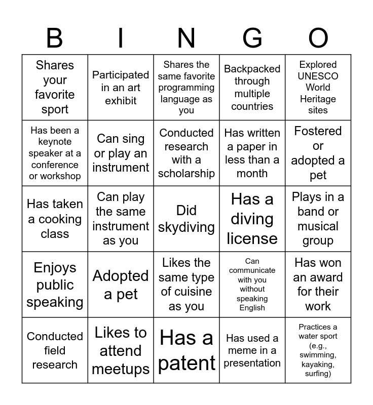 This bingo card has 81 words: Shares the same favorite programming language as you, Free!, Shares the same favorite programming language as you, Has presented a paper at a ML conference, Has co-authored a paper with researchers from another country, Has completed a marathon, Participated in a hackathon, Has performed in a theater production, Has experienced living in a different country, Loves dad jokes, Has received a grant for their research, Speaks four languages or more, Backpacked through multiple countries, Shares your favorite sport, Published a book or a short story, Has been a keynote speaker at a conference or workshop, Practices yoga regularly, Adopted a pet, Volunteers regularly, Plays in a band or musical group, Has read more than 50 books in a year, Explored UNESCO World Heritage sites, Has taken a cooking class, Conducted research with a scholarship, Can sing or play an instrument, Has taken a road trip, Can code in multiple programming languages, Mentored someone, Has given a remote presentation, Has hiked famous trails (e.g., Appalachian Trail, Camino de Santiago), Fostered or adopted a pet, Favorite colour is the same as yours, Has a patent, Practices a water sport (e.g., swimming, kayaking, surfing), Conducted field research, Has a diving license, Lived in multiple continents, Had been to Austria before, Had a different career before starting their PhD, Can juggle, Did skydiving, Has been in 4 continents, Worked in a startup, Swam with dolphins, Can play the same instrument as you, Traveled solo to a foreign country, Participated in an art exhibit, Has visited more than 20 countries, Works in the same field as yours, Has taken a sabbatical, Can communicate with you without speaking English, Has won an award for their work, Plays chess, Has been to a silent retreat, Can solve a Rubik's Cube, Has collaborated with a company on research, Has taken dance classes, Can knit or crochet, Likes the same genre of movies as you, Has worked remotely for over a year, Likes the same type of cuisine as you, Enjoys painting or drawing, Has taught a course, Has written a blog or articles online, Is an early riser, Has a unique hobby, Has run a research lab, Has organized a workshop or a conference, Has created an educational video, Can code in a low-level programming language (e.g., Assembly), Has participated in a book club, Enjoys public speaking, Likes to attend meetups, Likes to attend hackathons, Enjoys hiking or outdoor activities, Has a side project they are passionate about, Is a night owl, Has used a meme in a presentation, Has an epic collection of conference swag, Has written a paper in less than a month and Is attending a WiML event for the first time.