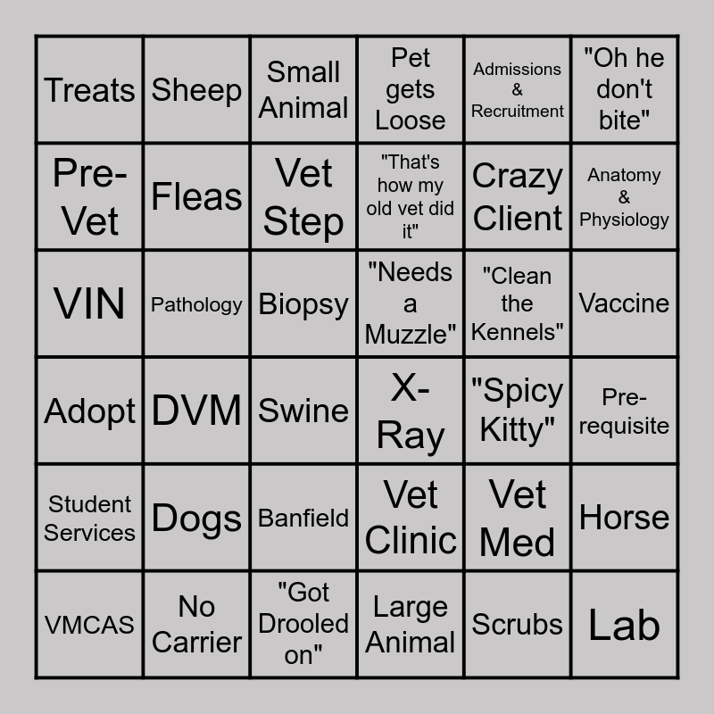 This bingo card has 89 words: Vet Life, No Leash, Vaccine, Puppies, Rabies, Sutures, Dean Perry, Vet Med, Patterson Hall, Animal Lover, "No Call, No Show", Surgery, DVM, Biopsy, "He's a Rescue", Fleas, Vet Clinic, Large Animal, Parvo, Research, AAVMC, Lab, "Spicy Kitty", HBCU, Crazy Client, X-Ray, Stray, Exotic Pets, Emergency, Shelter Medicine, Pet gets Loose, Anatomy & Physiology, "Got Peed On", Treats, VMCAS, Small Animal, "Oh he don't bite", Meow, "That's how my old vet did it", Swine, "Needs a Muzzle", No Carrier, Scrubs, Goats, Adopt, Pathology, Woof, "Got Drooled on", 4 yrs of Vet School, Sheep, Exams, Paws, Tuskegee University, NAVLE, Grand Rounds, Clinical Rotations, Cats, Dogs, TigerWeb, Orientation, 1st Year, Study Sessions, Finals, 8:00am Class, Dog Slobber, Long Lectures, Animal Experience, Caffeine, Horse, "Clean the Kennels", VIN, Banfield, Dr. Fredrick D. Patterson, Vet Step, Pre-Vet, Pre-requisite, Biochemistry, Animal Science, Dr. Gilbreath, Student Services, Admissions & Recruitment, Accepted!, Pre-Vet Club, TUCVM, Wildlife, Internship, SERP, Dog Breath and Summer Break.