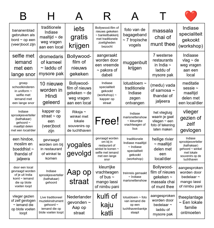 This bingo card has a free space and 389 words: Indiaase vlag ~ winkel met lokale souvenirs op de luchthaven, heilige rivier ~ Bollywood-film of nieuws gekeken, Indiase specialiteit gekookt (workshop) ~ selfie met iemand met een lange snor, het vliegtuig waarin je gaat vliegen ~ pakora of dabeli, meditatie sessie ~ maaltijd delen met een local/dier, Live traditioneel muziekinstrument gehoord ~ theeplantage, een local 5 Nederlandse worden geleerd ~ Live traditioneel muziekinstrument gehoord, Koe op straat ~ meditatie sessie, treinreis gemaakt ~ lotusbloem, Indiase bruiloft of baraat ~ muurschildering van een godheid, yogales gevolgd ~ een hindoe, moslim en boeddhist, Schildpad ~ lokale ambachtsman aan het werk zien, dromedaris of kameel ~ iets gratis krijgen, 10 nieuwe worden in Hindi geleerd ~ door een local gevraagd worden of je uit India komt, treinreis gemaakt ~ Indiase marionettenshow, Indiaase vlag ~ een hindoe, moslim en boeddhist, vlieger gezien of zelf gevlogen ~ cricket spel zien op straat, maaltijd delen met een local/dier ~ muggenbult krijgen, Een lokale familie ontmoeten ~ door een local gevraagd worden of je uit India komt, Indiase specialiteit gekookt (workshop) ~ cricket spel zien op straat, bananenblad gebruiken als bord ~ banana chips of patat eten, dromedaris of kameel ~ thandai of jaljeera, man met een tulband ~ 2 indiaanse ayurvedische producten, Live traditioneel muziekinstrument gehoord ~ selfie met iemand met een lange baard, katoenen shawl of sjaal gekocht ~ foto van de bagageband, offer gegeven in een tempel ~ 7 westerse restaurants in India, Indiase marionettenshow ~ selfie met je boarding pass, kulfi of kaju katli ~ laddu of mysore pak, selfie met iemand met een lange snor ~ rasgulla of jalebi, foto van iemand die op een luchthavenbankje slaapt ~ pakora of dabeli, Live traditioneel muziekinstrument gehoord ~ lotusbloem, meditatie sessie ~ 5 neppe merken, selfie met iemand met een lange baard ~ laddu of mysore pak, 5 neppe merken ~ op een (veer)boot zijn, iets gratis krijgen ~ 5 neppe merken, een local 5 Nederlandse worden geleerd ~ 5 neppe merken, kapper op straat ~ het vliegtuig waarin je gaat vliegen, flinke regenbui meemaken ~ groep schoolkinderen in uniform, katoenen shawl of sjaal gekocht ~ man met een tulband, heilige rivier ~ maaltijd delen met een local/dier, Riksja ~ Aap op straat, Indiase sprookjesverteller (kathakaar) gehoord ~ maaltijd delen met een local/dier, traditionele Indiase maaltijd ~ Indiase sprookjesverteller (kathakaar) gehoord, politie agent ~ selfie met iemand met een lange baard, katoenen shawl of sjaal gekocht ~ winkel met lokale souvenirs op de luchthaven, luchthavenmedewerker in uniform ~ banana chips of patat eten, Koe op straat ~ politie agent, sari of kurta gekocht ~ selfie met iemand met een lange snor, Live traditioneel muziekinstrument gehoord ~ iemand die op blote voeten loopt, Tuk-tuk met of zonder nitro ~ het vliegtuig waarin je gaat vliegen, dromedaris of kameel ~ groepsfoto met bagagekarren, vlieger gezien of zelf gevlogen ~ foto van iemand die op een luchthavenbankje slaapt, traditionele Indiase maaltijd ~ banana chips of patat eten, theeplantage ~ school, traditionele Indiase maaltijd ~ flinke regenbui meemaken, 7 street food kraampjes ~ foto van de bagageband, een hindoe, moslim en boeddhist ~ rasgulla of jalebi, Aap op straat ~ cricket spel zien op straat, vlieger gezien of zelf gevlogen ~ school, (stoel)massage krijgen ~ Gulab jamun of kheer, heilige boom met offergaven ~ opvallend kunstwerk op de luchthaven, lokale ambachtsman aan het werk zien ~ 3 indiaanse ambachtelijke producten, traditionele Indiase maaltijd ~ door een local gevraagd worden of je uit India komt, lotusbloem ~ traditionele Indiase zegen ontvangen, Indiaase vlag ~ de weg vragen aan een local, school ~ kulfi of kaju katli, foto van de bagageband ~ selfie met iemand met een lange snor, maaltijd delen met een local/dier ~ de weg vragen aan een local, traditionele Indiase maaltijd ~ dromedaris of kameel, 7 westerse restaurants in India ~ laddu of mysore pak, maaltijd delen met een local/dier ~ 3 indiaanse ambachtelijke producten, 10 nieuwe worden in Hindi geleerd ~ Indiase sprookjesverteller (kathakaar) gehoord, Indiase specialiteit gekookt (workshop) ~ (stoel)massage krijgen, het vliegtuig waarin je gaat vliegen ~ laddu of mysore pak, traditionele Indiase maaltijd ~ selfie met je boarding pass, aangesproken worden door bedelaar ~ 5 neppe merken, katoenen shawl of sjaal gekocht ~ iemand die op straat slaapt, lokaal gemaakt instrument of kookgerei kopen ~ (stoel)massage krijgen, Bollywood-film of nieuws gekeken ~ foto van de bagageband, olifant ~ flinke regenbui meemaken, Koe op straat ~ een hindoe, moslim en boeddhist, lokale markt bezocht ~ 10 nieuwe worden in Hindi geleerd, cricketwedstrijd gezien ~ iemand die op straat slaapt, katoenen shawl of sjaal gekocht ~ maaltijd delen met een local/dier, vlieger gezien of zelf gevlogen ~ iemand die op blote voeten loopt, lotusbloem ~ 3 indiaanse ambachtelijke producten, Nederlander gevonden ~ lokaal gemaakt instrument of kookgerei kopen, Aap op straat ~ Schildpad, foto van de bagageband ~ (medu) vada of samosa, dansvoorstelling ~ 2 indiaanse ayurvedische producten, traditionele Indiase zegen ontvangen ~ het vliegtuig waarin je gaat vliegen, offer gegeven in een tempel ~ een hindoe, moslim en boeddhist, sari of kurta gekocht ~ 2 indiaanse ayurvedische producten, winkel met lokale souvenirs op de luchthaven ~ een hindoe, moslim en boeddhist, gevraagd worden om bij in restaurant of winkel te komen ~ 2 indiaanse ayurvedische producten, heilige boom met offergaven ~ selfie met iemand met een lange baard, bananenblad gebruiken als bord ~ de weg vragen aan een local, aangesproken worden door bedelaar ~ mango lassi of nimbu pani, mango lassi of nimbu pani ~ thandai of jaljeera, selfie met je boarding pass ~ opvallend kunstwerk op de luchthaven, traditionele Indiase zegen ontvangen ~ heilige boom met offergaven, een h