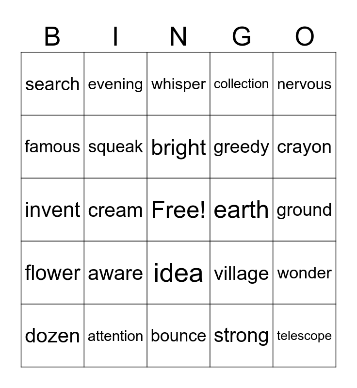 This bingo card has a free space and 24 words: aware, attention, bright, dozen, nervous, search, famous, evening, earth, idea, greedy, invent, village, wonder, squeak, strong, ground, whisper, crayon, cream, telescope, flower, collection and bounce.