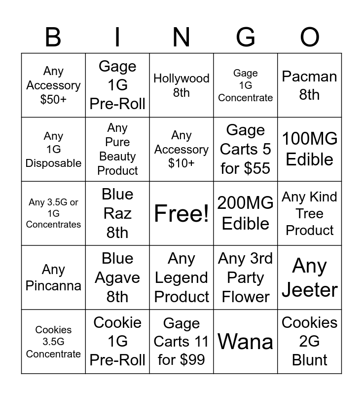 This bingo card has a free space and 24 words: Blue Agave 8th, Cookie 1G Pre-Roll, Any Accessory $10+, Cookies 3.5G Concentrate, Pacman 8th, Any Accessory $50+, Any 1G Disposable, Gage 1G Pre-Roll, 200MG Edible, Any Legend Product, Gage Carts 5 for $55, Any 3.5G or 1G Concentrates, Any 3rd Party Flower, Any Jeeter, Any Pure Beauty Product, Wana, Any Kind Tree Product, Hollywood 8th, 100MG Edible, Blue Raz 8th, Cookies 2G Blunt, Any Pincanna, Gage 1G Concentrate and Gage Carts 11 for $99.