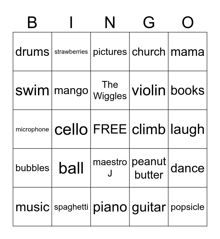 This bingo card has a free space and 24 words: ball, spaghetti, The Wiggles, music, mama, drums, swim, strawberries, climb, maestro J, violin, microphone, peanut butter, dance, mango, guitar, laugh, pictures, books, cello, popsicle, bubbles, church and piano.
