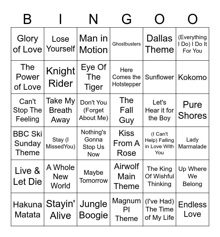 This bingo card has 36 words: Airwolf Main Theme, Maybe Tomorrow, Magnum PI Theme, The Power of Love, BBC Ski Sunday Theme, The Fall Guy, Knight Rider, Jungle Boogie, Dallas Theme, The King Of Wishful Thinking, Kokomo, Ghostbusters, Up Where We Belong, Take My Breath Away, Here Comes the Hotstepper, Glory of Love, Live & Let Die, Let's Hear it for the Boy, Can't Stop The Feeling, Man in Motion, Don't You (Forget About Me), Stay (I MissedYou), Kiss From A Rose, Nothing's Gonna Stop Us Now, (I Can't Help) Falling in Love With You, Lose Yourself, Sunflower, Stayin' Alive, Eye Of The Tiger, (Everything I Do) I Do It For You, Endless Love, Hakuna Matata, Lady Marmalade, Pure Shores, A Whole New World and (I've Had) The Time of My Life.