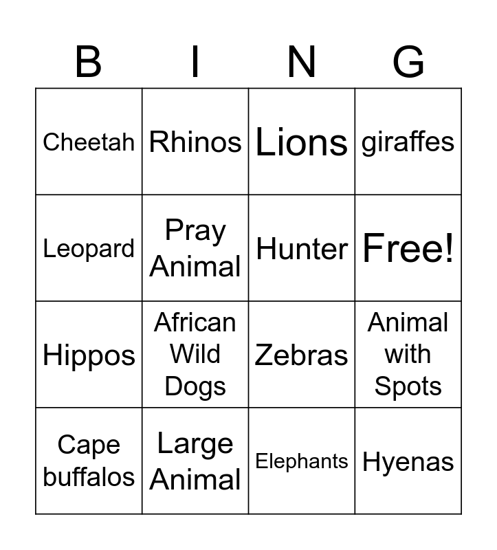This bingo card has 18 words: African Wild Dogs, Hyenas, Lions, Cheetah, Zebras, giraffes, Cape buffalos, Rhinos, Free!, Hippos, Elephants, Leopard, Animal with Spots, Pray Animal, Hunter, Animal with Strips, Large Animal and Loud Animal.