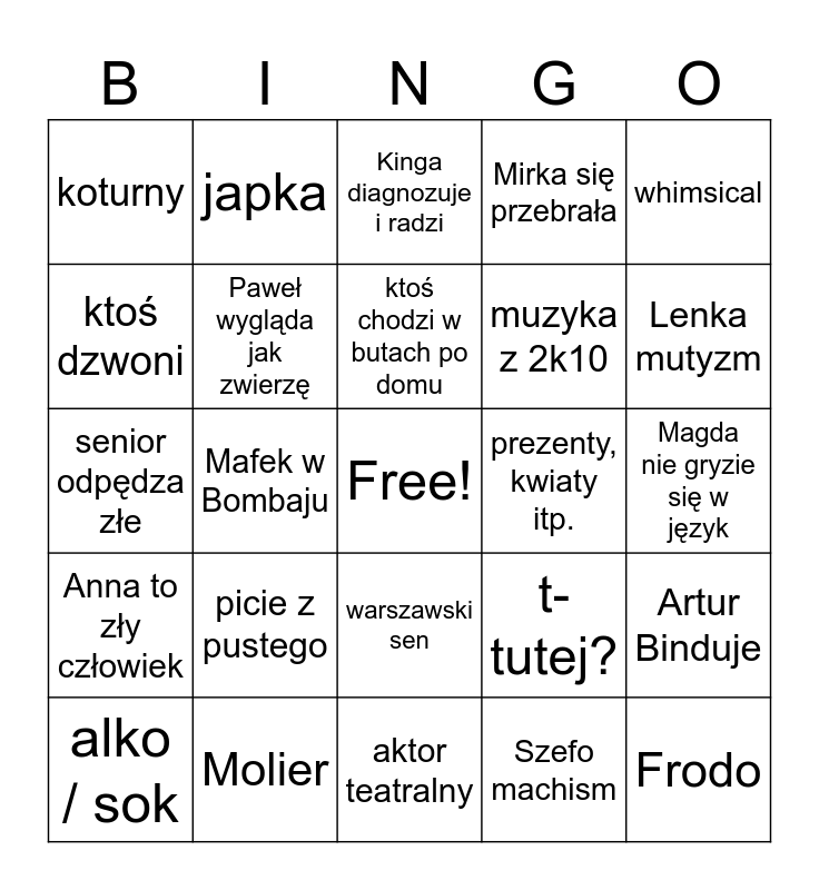 This bingo card has a free space and 24 words: picie z pustego, Molier, ktoś chodzi w butach po domu, alko / sok, whimsical, koturny, ktoś dzwoni, japka, prezenty, kwiaty itp., warszawski sen, muzyka z 2k10, senior odpędza złe, t-tutej?, Artur Binduje, Paweł wygląda jak zwierzę, Szefo machism, Magda nie gryzie się w język, Kinga diagnozuje i radzi, Lenka mutyzm, Mafek w Bombaju, Frodo, Anna to zły człowiek, Mirka się przebrała and aktor teatralny.