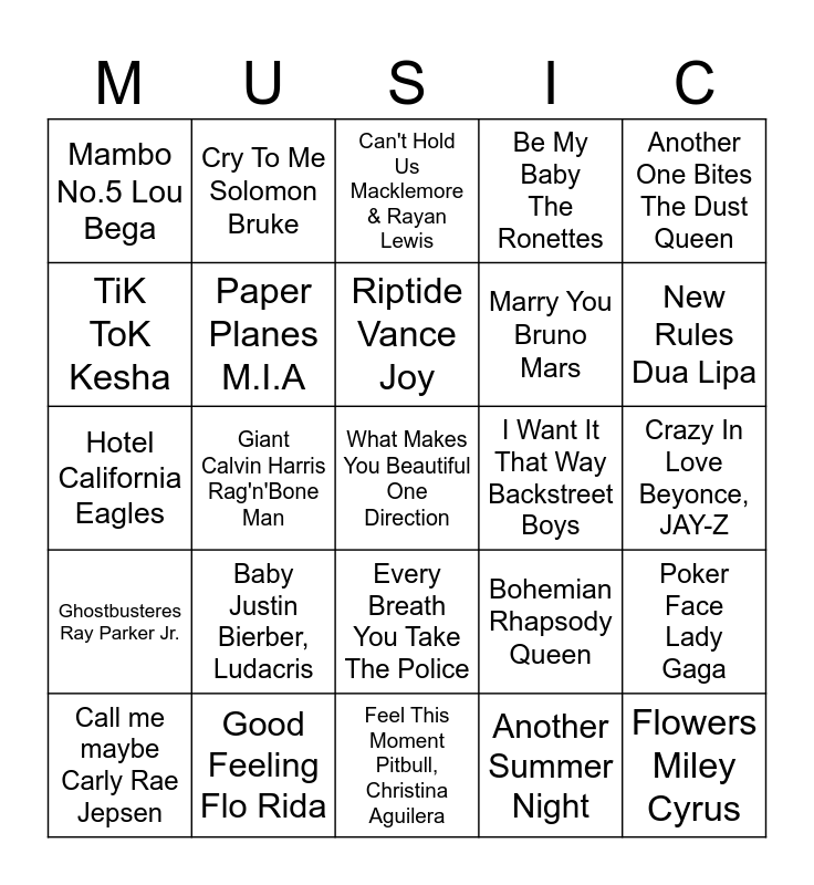 This bingo card has a free space and 29 words: Call me maybe Carly Rae Jepsen, Your Love ATB, Topic, A7S, Giant Calvin Harris Rag'n'Bone Man, Umbrella Rihanna, JAY-Z, Mambo No.5 Lou Bega, Can't Hold Us Macklemore & Rayan Lewis, Paper Planes M.I.A, Baby Justin Bierber, Ludacris, I Want It That Way Backstreet Boys, Good Feeling Flo Rida, Crazy In Love Beyonce, JAY-Z, Flowers Miley Cyrus, Feel This Moment Pitbull, Christina Aguilera, Another Summer Night, New Rules Dua Lipa, YMCA Village People, Every Breath You Take The Police, Ghostbusteres Ray Parker Jr., Another One Bites The Dust Queen, Hotel California Eagles, Bohemian Rhapsody Queen, Wake Me Up Before You Go-Go Wham, Marry You Bruno Mars, TiK ToK Kesha, Be My Baby The Ronettes, Cry To Me Solomon Bruke, Poker Face Lady Gaga, Riptide Vance Joy and Just The Way You Are.