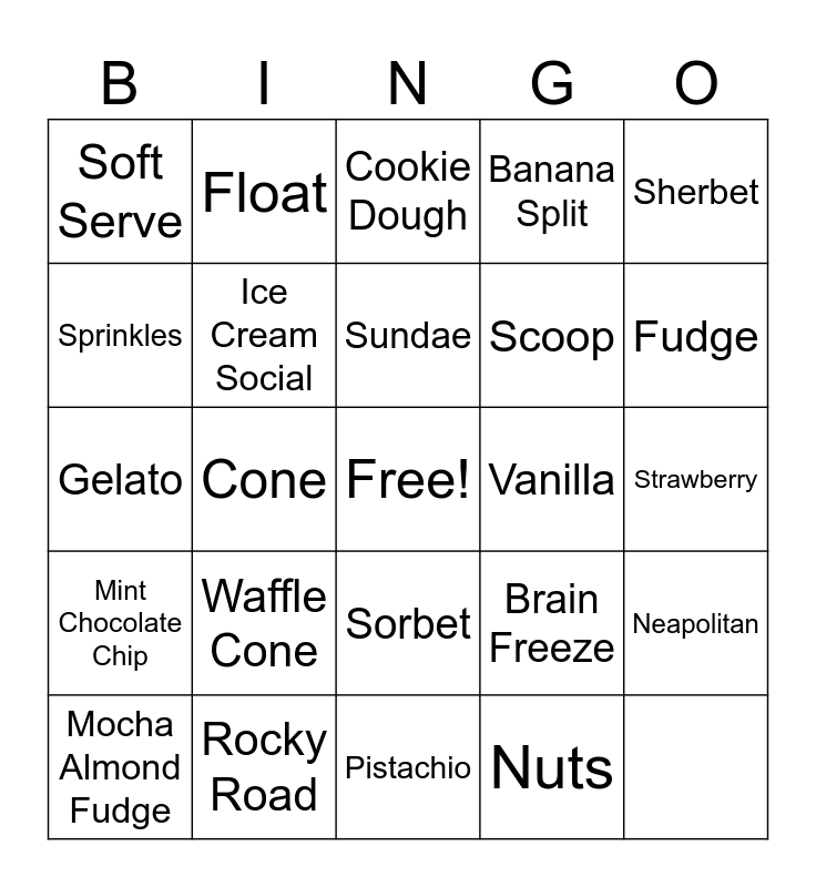 This bingo card has a free space and 24 words: Mint Chocolate Chip, Rocky Road, Sorbet, Brain Freeze, Sherbet, Soft Serve, Float, Cookie Dough, Scoop, Neapolitan, Sprinkles, Ice Cream Social, Caramel, Vanilla, Fudge, Mocha Almond Fudge, Cone, Sundae, Banana Split, Strawberry, Gelato, Waffle Cone, Pistachio and Nuts.