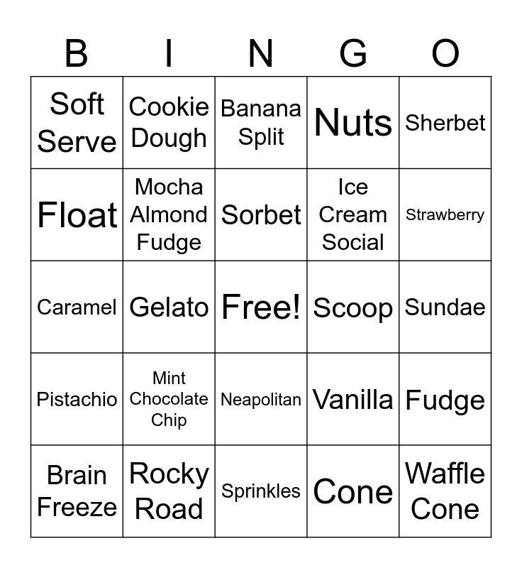 This bingo card has a free space and 24 words: Mint Chocolate Chip, Rocky Road, Sorbet, Brain Freeze, Sherbet, Soft Serve, Float, Cookie Dough, Scoop, Neapolitan, Ice Cream Social, Caramel, Vanilla, Fudge, Mocha Almond Fudge, Cone, Sundae, Banana Split, Strawberry, Gelato, Waffle Cone, Pistachio, Nuts and Sprinkles.