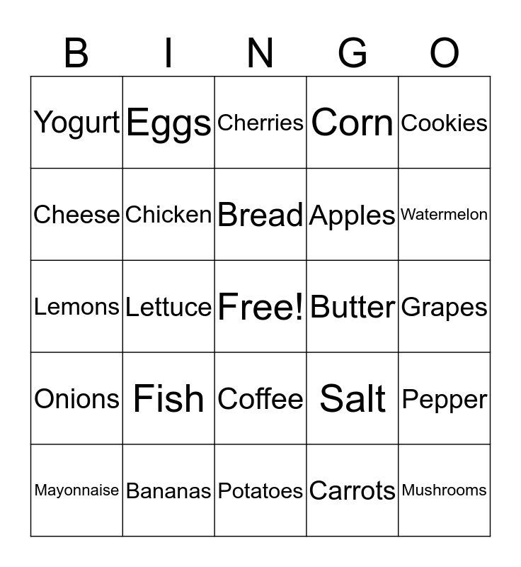 This bingo card has a free space and 24 words: Fish, Bananas, Bread, Mayonnaise, Cookies, Yogurt, Cheese, Eggs, Butter, Coffee, Apples, Lemons, Salt, Pepper, Chicken, Carrots, Grapes, Cherries, Watermelon, Lettuce, Mushrooms, Onions, Corn and Potatoes.