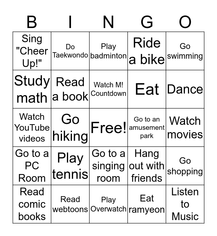 This bingo card has a free space and 31 words: Play Overwatch, Watch TV, Go hiking, Study English, Sing "Cheer Up!", Play badminton, Read a book, Hang out with friends, Go to an amusement park, Eat ramyeon, Watch movies, Listen to Music, Play soccer, Go to a cafe, Dance, Go camping, Go shopping, Play tennis, Go to a PC Room, Go to a singing room, Go swimming, Play baseball, Read comic books, Do Taekwondo, Eat, Study math, Ride a bike, Watch YouTube videos, Read webtoons, Watch M! Countdown and Play board games.