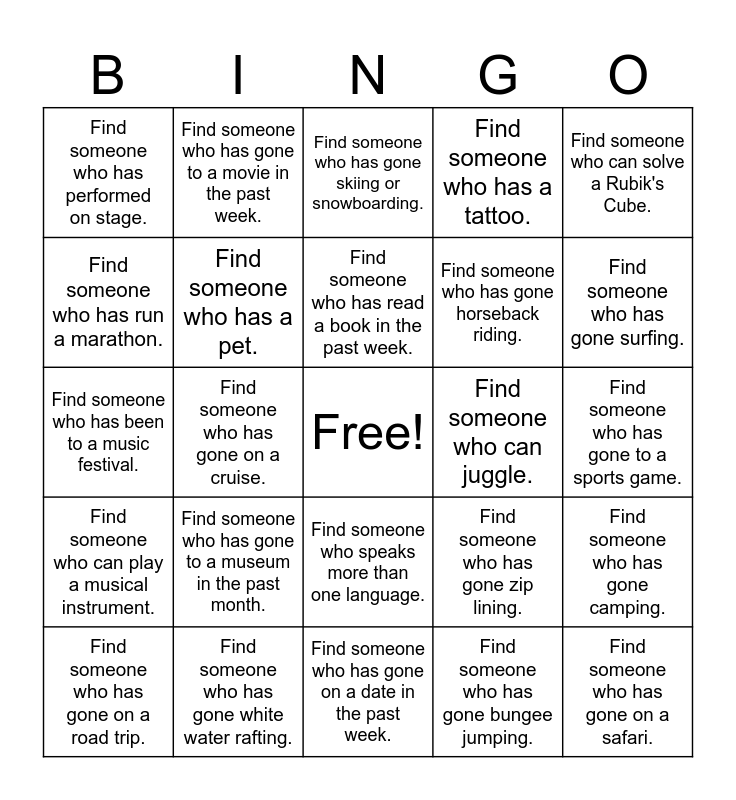 This bingo card has a free space and 35 words: Find someone who has the same birthday month as you., Find someone who has traveled to at least three different countries., Find someone who can name all the states in the USA., Find someone who has a pet., Find someone who speaks more than one language., Find someone who has a tattoo., Find someone who has run a marathon., Find someone who can cook a three-course meal., Find someone who has read a book in the past week., Find someone who has gone skydiving., Find someone who has been to a music festival., Find someone who can solve a Rubik's Cube., Find someone who has gone scuba diving., Find someone who has climbed a mountain., Find someone who has performed on stage., Find someone who can juggle., Find someone who has gone bungee jumping., Find someone who has gone on a cruise., Find someone who can play a musical instrument., Find someone who has gone on a safari., Find someone who has gone zip lining., Find someone who has gone on a road trip., Find someone who has gone camping., Find someone who has gone white water rafting., Find someone who has gone skiing or snowboarding., Find someone who has gone surfing., Find someone who has gone on a hot air balloon ride., Find someone who has gone on a helicopter ride., Find someone who has gone horseback riding., Find someone who has gone to a sports game., Find someone who has gone to a concert., Find someone who has gone on a date in the past week., Find someone who has gone to a museum in the past month., Find someone who has gone to a movie in the past week. and Find someone who has gone to a theme park..