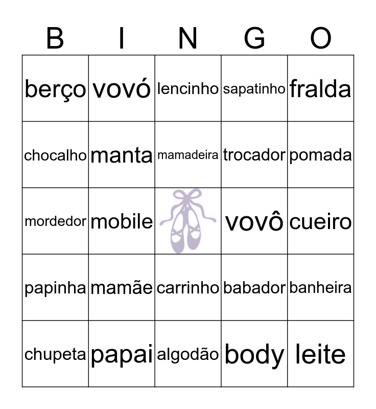 This bingo card has a free space and 24 words: mamãe, papai, mamadeira, chupeta, fralda, berço, chocalho, vovó, vovô, carrinho, trocador, mordedor, babador, banheira, manta, body, cueiro, lencinho, pomada, mobile, leite, papinha, sapatinho and algodão.